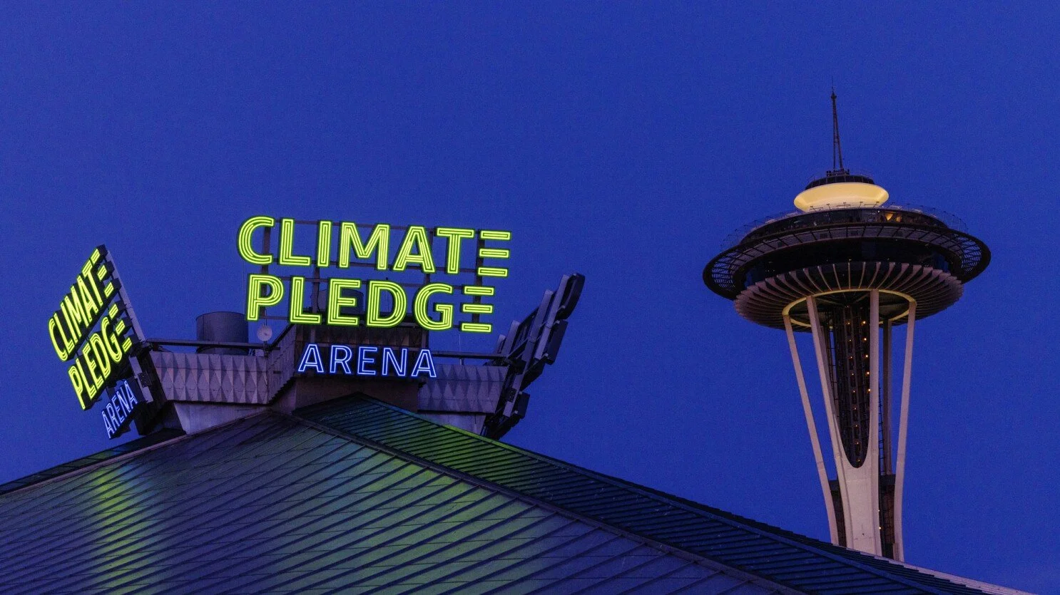 Climate Pledge Arena signage with Space Needle in background - Amazon